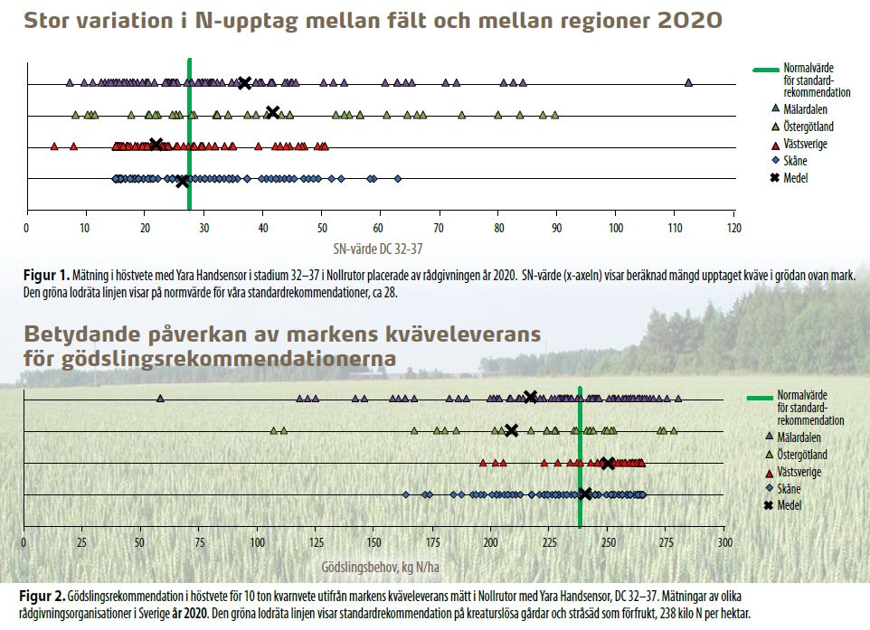 Vid en jämförelse med mätningar under 2020 i Nollrutor i höstvete med mätningar från 2019 framkommer en mycket stor skillnad mellan åren (jämför figur 2 och 3). För en skörd på 10 ton var rådet i medeltal 50–60 kilo N lägre per hektar år 2019 i Mälardalen och Östergötland. Det fanns säkert en betydande mängd restkväve kvar på många torkdrabbade fält hösten 2018, kväve som sedan fanns kvar i marken efter den mycket torra hösten och vintern i östra Sverige. För 2020 var situationen en annan. En bra gröda 2019 hade tömt marken på kväve så som vi normalt räknar med att den ska göra.
