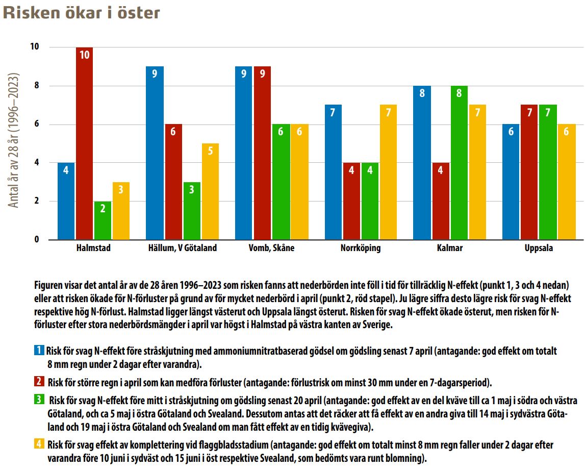 För att få en idé om hur det ser ut på olika platser kan man titta på historisk nederbörd på SMHIs väderstationer. Jag har därför undersökt 4 indikatorer på ett antal platser i Götaland och Svealand för åren 1996–2023. De omfattar (1) risken för svag N-effekt före stråskjutning, (2) risk för N-förluster vid större regn i april, (3) risk för svag N-effekt mitt i stråskjutningen och (4) risk för svag N-effekt av kompletteringsgödsling.