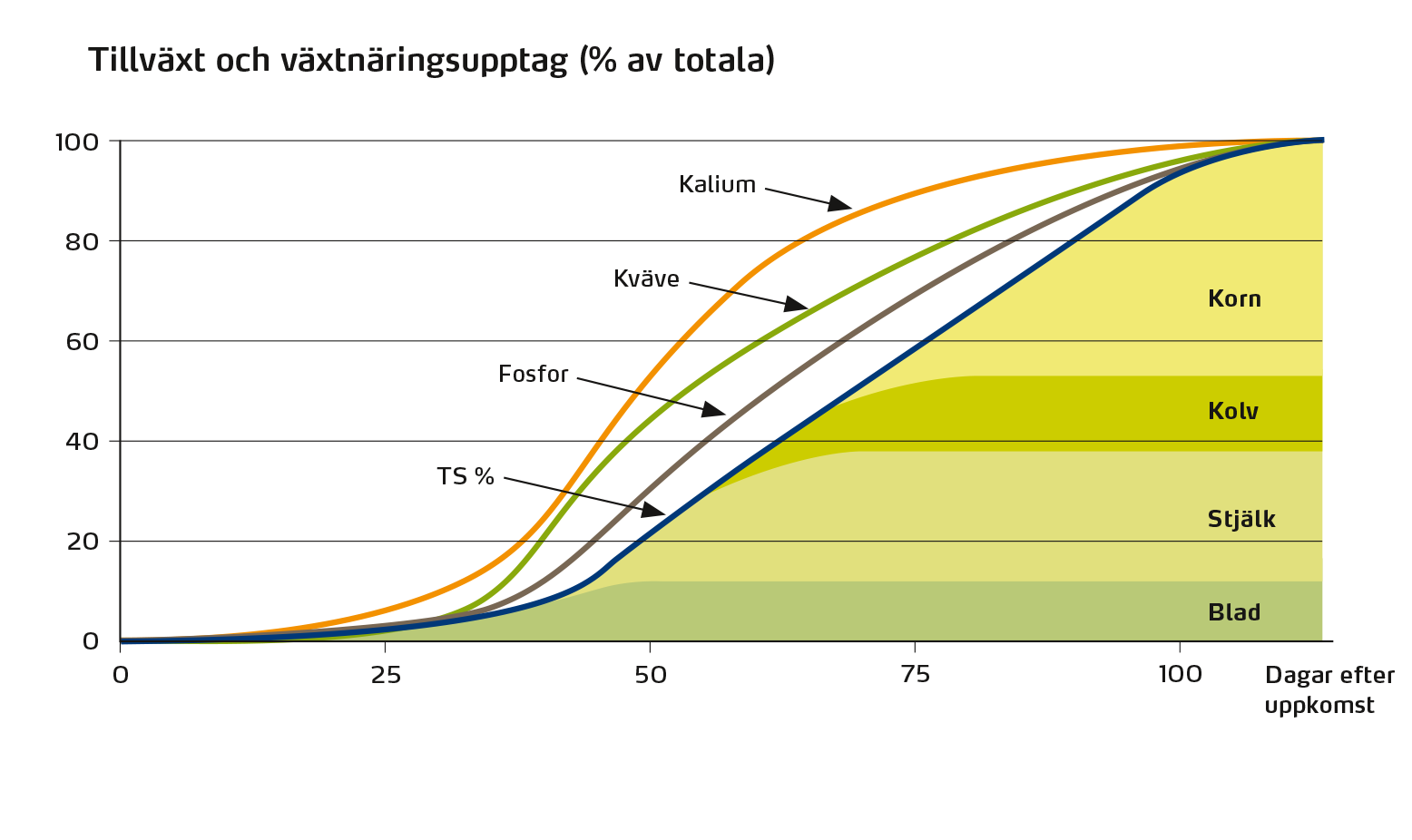 Eftersom majsen utvecklas långsamt i början av odlingssäsongen och därmed har ett lågt växtnäringsupptag, är det viktigt att inte överdosera stallgödselgivan på våren. Risken för växtnäringsläckage är stor om mer stallgödsel tillförs än vad grödan kan utnyttja. Se majsens näringsupptag i figuren.