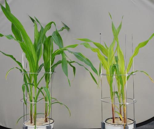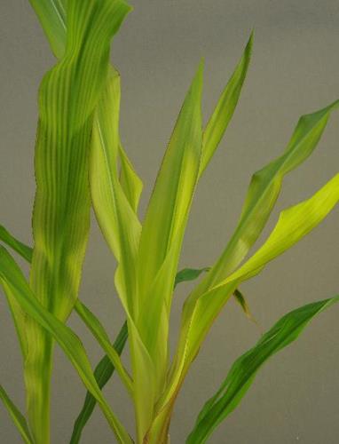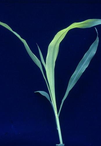 Plantans tillväxt hämmas och plantan blir förkrympt men växer upprätt. Sett på håll blir yngre blad uniformt ljusare i färgen. På nära håll syns kloroser mellan nerverna.