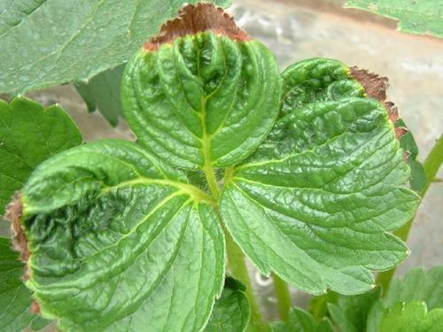 Yngre blad med nekrotiska bladspetsar. Missbildade blad pga veckade blad och bladspetsar.
