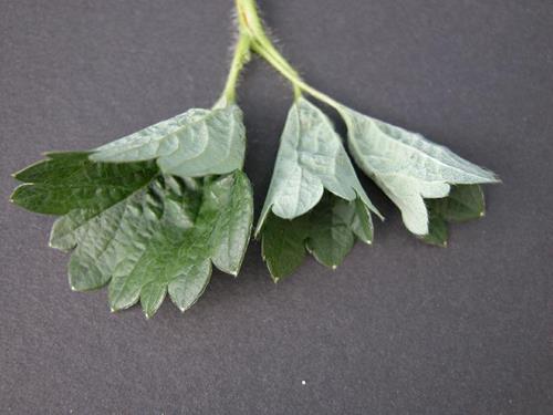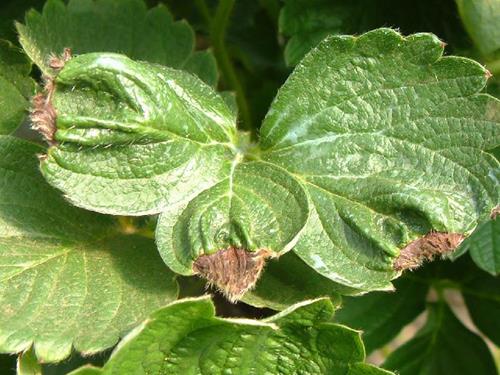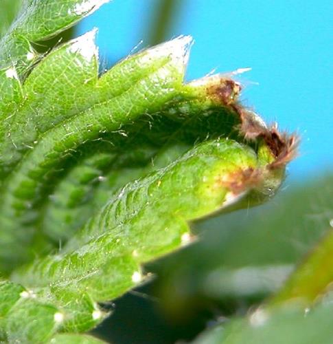 Yngre blad får skador på bladspetsen. Bladen skrynklas ihop.