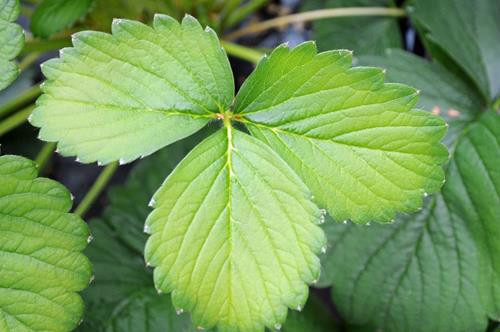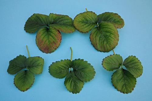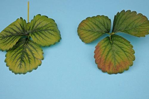 Zinkbrist orsakar kloroser både på unga och äldre blad. Nerver och sågtandade bladkanter förblir gröna.