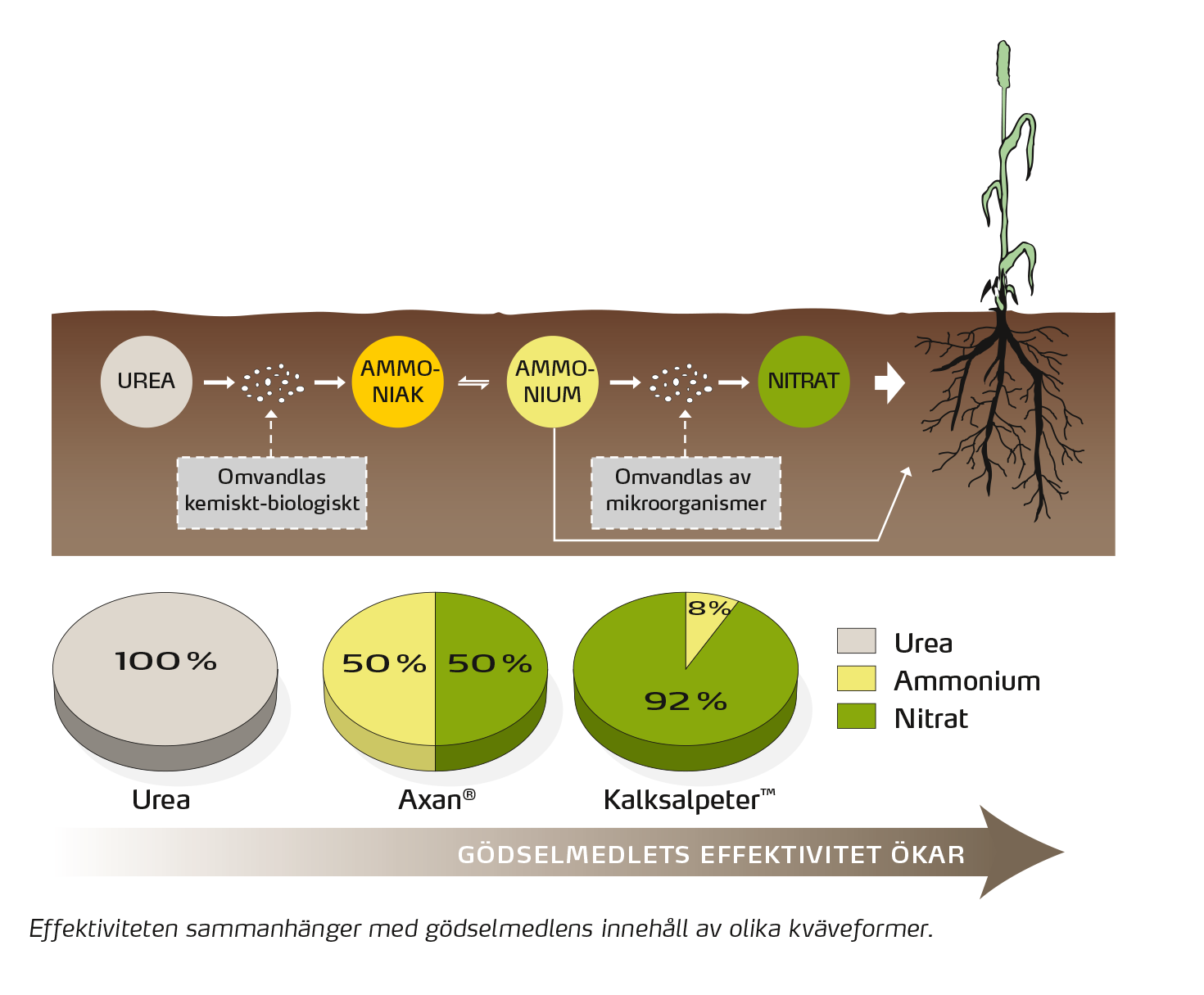 - Axan, Sulfan, N27 och de flesta YaraMila-produkter består till hälften av ammoniumkväve och till hälften av nitratkväve. Dessa produkter har alltså en lättupptagbar del och en del som först måste omvandlas till nitrat innan det kan tas upp.