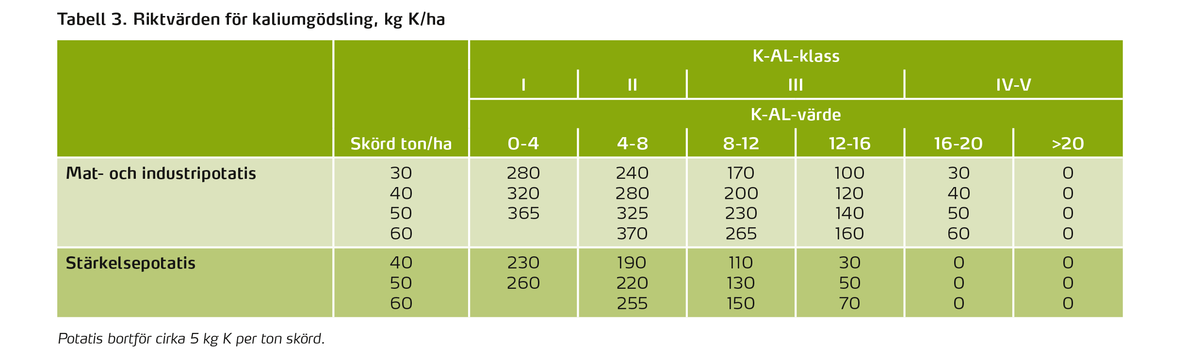 Kalium ger minskad risk för både mörkfärgning efter kokning och enzymatisk mörkfärgning (stötblått). För mycket kalium kan sänka ts-halten och medföra blötkokning. På grund av höga kvalitetskrav är kaliumbehovet stort i matpotatis. Potatis till stärkelseproduktion har däremot ett lägre behov, se tabell 3. För en säker bedömning av kaliumbehovet bör alltid en ”färsk” jordanalys ligga till grund. Endast klorfria kaliumgödselmedel ska användas.
