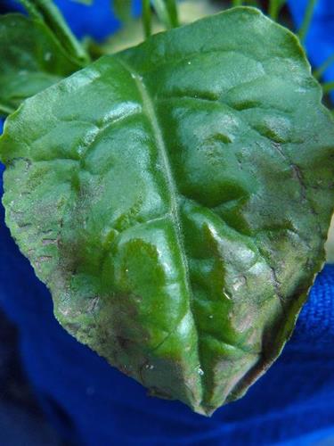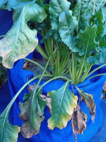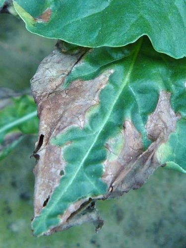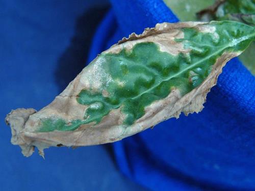 Kaliumbrist. Symptomen på de nedre förtorkade bladen är likartade för K- och Mg-brist .