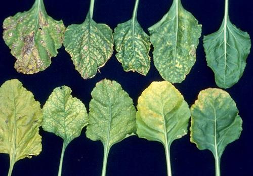 Manganbrist visar också liknande symtom, men dessa börjar på yngre blad.