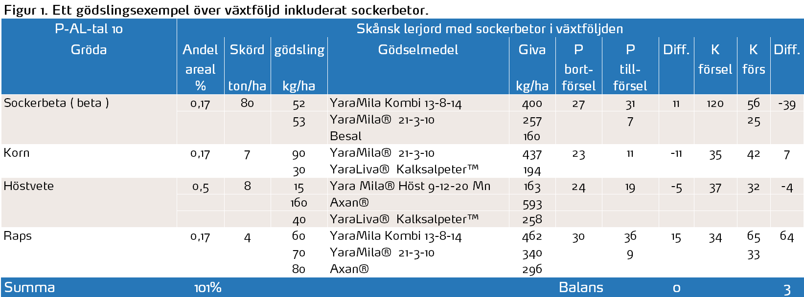 Exemplet visar en vanlig sexårig växtföljd: sockerbetor – vårkorn – höstvete – höstraps – höstvete – höstvete. Jordtypen är lerjord och fosfortillståndet ligger på det önskade P-AL-talet för sockerbetor, P-AL 10. Exemplet illustrerar hur man över en växtföljd kan uppnå en balanserad gödsling och samtidigt hålla antalet gödselprodukter på en rimlig nivå. Önskat markvärde underhålls där överskottet riktas till sockerbetor och raps, grödor som svarar mest på fosfor.