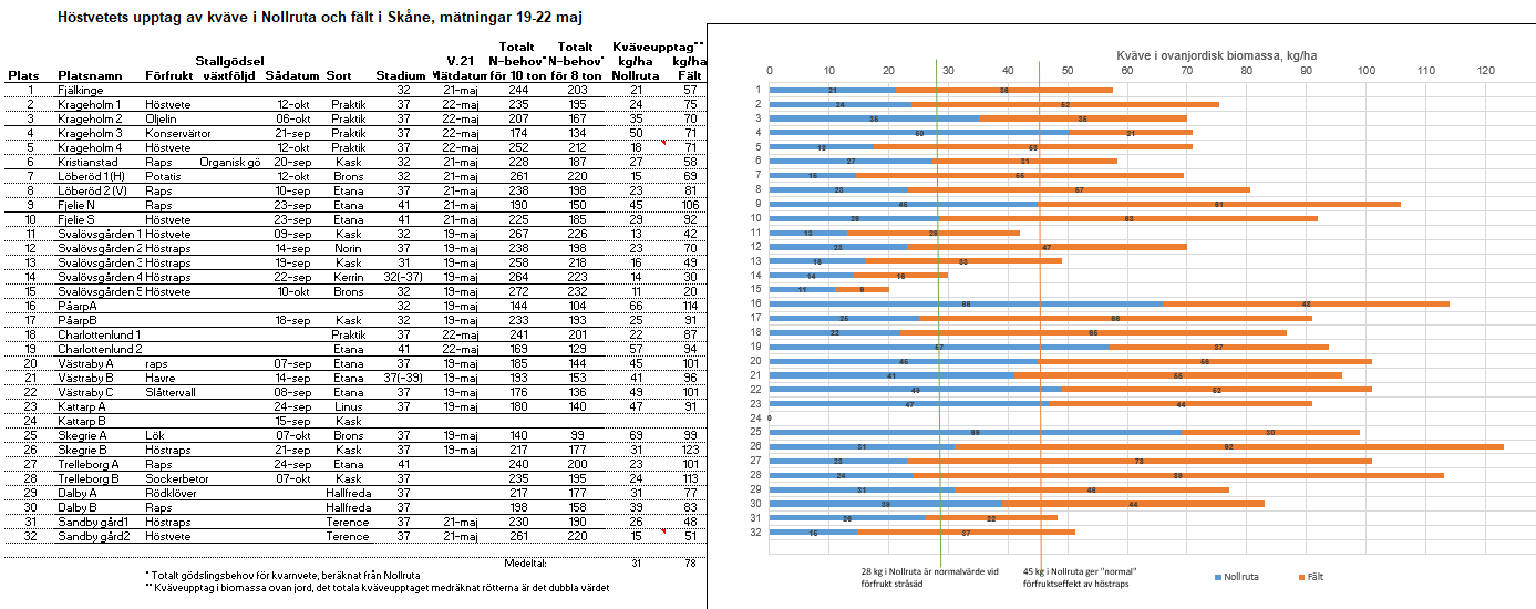 Nybble 1 är en nollruta med medelhög markleverans för området. Ovanjordiskt N-upptag i nollrutan 26 kg N/ha och i omgivande fält 107 kg N/ha. Plantorna var i DC 43 (flaggbladets slida börjar vidgas) vid mätningen.