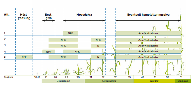 Kalksalpeter är den mest effektiva produkten vid tidpunkten för kompletteringsgödsling. Om Axan eller N27 används ska man tänka på att dessa produkter inte är lika snabbverkande och därför bör tillföras tidigare.
