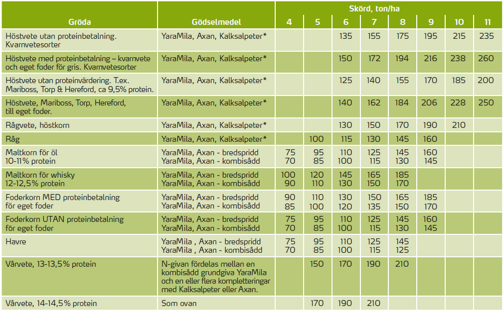 Generella kväverekommendationer för totala kvävegivan framgår av tabellen ovan. Den totala kvävegivan bör alltid delas på flera givor, eftersom detta minskar risken för liggsäd och möjliggör att önskad proteinhalt uppnås. Delning innebär också bättre kväveutnyttjande och minskar risken för negativ miljöpåverkan.